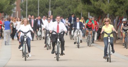 Rajoy, flanked by his party hopefuls for Madrid mayor and regional premier, braves the scorching Madrid weather on bikes