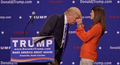 El candidato a la presidencia de EE UU hace a una mujer del público examinar su cabeza para contradecir un artículo de prensa