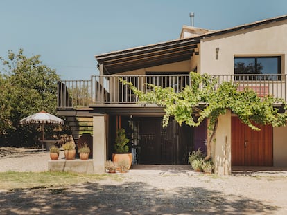 Hoy la casa, que cuenta con algo más de 200 metros cuadrados, dispone de una planta baja protagonizada por la cocina a medida –con salida al patio y conformada por muebles de acero inoxidable que contrastan con el estilo rústico de la finca y, además, reflejan la luz para dar mayor luminosidad– y un salón con chimenea y sofá en forma de trapecio hecho a medida, además de una zona de estar y un pequeño aseo. En la planta de arriba se despliega un salón de juegos bajo un precioso lucernario y un dormitorio, junto a un baño dividido con accesos independientes. Es decir, a un lado el inodoro junto al lavabo y, por otro, la ducha, que además tiene salida a una pequeña terraza donde también hay opción de ducharse al aire libre. Por último, unos peldaños más arriba, existe una última habitación, esta vez la de matrimonio, con salida a terraza. Las escaleras cuentan con una singular barandilla de rejilla de acero desarrollada por la compañía alemana Xtend, que otorga seguridad al tiempo que deja pasar la luz y aligera los espacios.