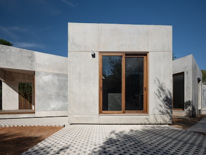 Para evitar ese impacto paisajístico, la solución fue ir quitando capas como hace un escultor a partir de la madera o la piedra. Ese inicial cubo blanco alargado se fue configurando lentamente hasta que se convirtió en distintos volúmenes de diferentes alturas que se dispersan a lo largo de la parcela. Son como piezas de un Lego que, en vez de unirse para componer una figura final, quedan separadas para obtener cuatro formas independientes y más sencillas. Todas están orientadas hacia la salida del sol para mejorar su eficiencia climática. Y están unidas por puentes, de tal manera que desde el primer espacio al último no hay ni un escalón. “Con esta disposición también conseguíamos que el paisaje se colase entre las construcciones”, destaca el arquitecto, que realizó una maqueta en cartón y algunos croquis para presentar la idea. Era ya otoño de 2021. Las obras comenzaron en primavera de 2022 y acabaron dos años después.