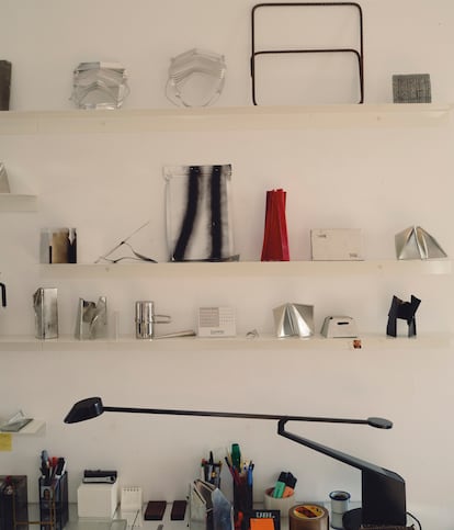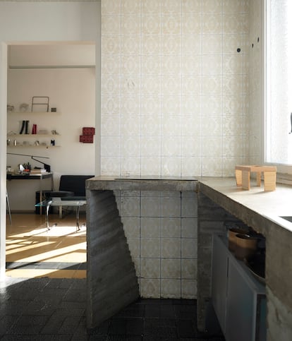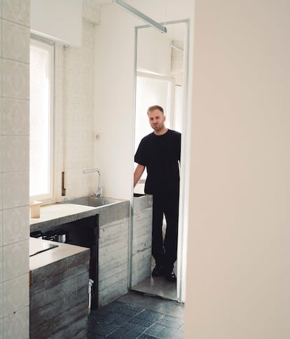 Se convirtió en una reforma experimental. ¿Que quería montar una estructura de hormigón en la cocina inspirada en el brutalismo de la vecina Iglesia de los Mexicanos de Madrid? Pues aprovechaba los sobrantes de encofrado que tiraban al contenedor de la obra del edificio de enfrente. ¿Que los dueños incumplían el compromiso de ponerle calefacción? Se traía una antigua estufa e instalaba él mismo el tubo de ventilación. ¿Que no había mueble en el baño ni la cocina? Inventaba uno de madera que comparten ambas estancias. ¿Que se iba a arruinar en lámparas? Fabricaba las suyas propias. “Decidí que todo fuera lo menos posible. A la vez, me tocó aprender de fontanería, de electricidad, de todo. Ya puedo ejercer de chapuzas”, sonríe. Apenas tiene un par de objetos de capricho, un antiguo sofá Pollock de cuero negro de Rodolfo Dordoni para Minotti, una mesa de comedor Trapèze de Jean Prouvé para Vitra y una serigrafía de 1973 de Calder que intercambió por obra con la que fuera su galería durante 10 años, Pelaires. La mesa del salón la facturó él mismo, y sirve de origen a Archivo Funcional, su proyecto de crear diseño industrial para otros. Algo que acaba de poner en práctica concibiendo las estructuras metálicas para el renovado kiosco de la nave La Mosca de Madrid.
