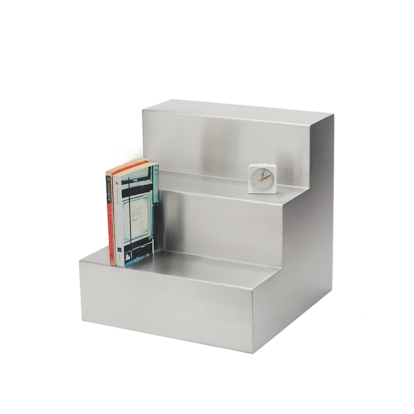 Una sencilla escalera transforma una mesa auxiliar en una pieza escultórica de acero pulido en la mente de este colectivo creativo afincado en Barcelona, autores de objetos atemporales donde prima un excelso diseño.