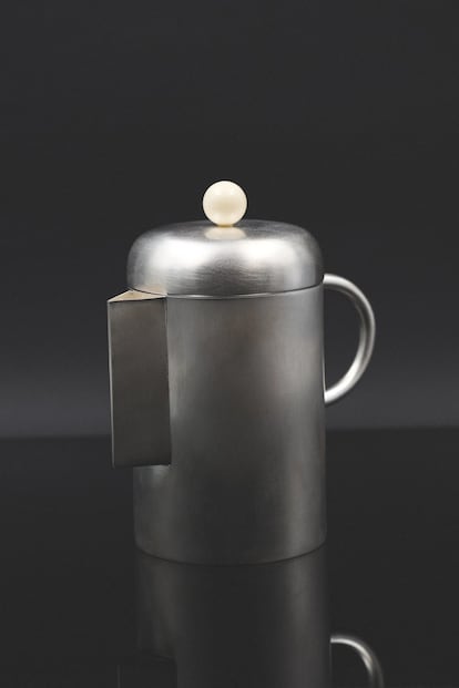 Cada objeto que diseña la artista colombiana resulta hipnótico con su pureza y aparente simplicidad, como esta jarra para servir el café esculpida en latón chapado en Italia.