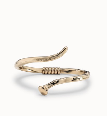 El clásico clavo de la marca nacida en Madrid a finales de los años noventa se reinventa con un diseño rígido y en espiral, bañado en oro de 18 quilates. Ese carácter irregular se remata con un muelle central que aporta textura, sin olvidar la pátina industrial tan de Uno de 50.