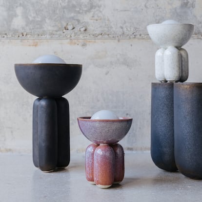 Cofundadora de Clay Studio, la diseñadora parisina afincada en Barcelona desde 2017 experimenta con las nociones de equilibrio y contraste que ofrece la cerámica en piezas como las lámparas Moor. Integrante de su firma homónima de muebles y luminarias, la esfera de cristal blanco que sobresale sutilmente difunde una luz suave y tenue, en contraste con esmaltes como el rosa empolvado.
