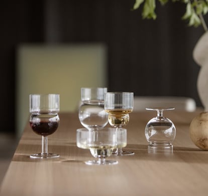 Detrás de su curvatura muestra no podría estar otro nombre que el del italiano Joe Colombo. Esta serie fabricada en cristal transparente, soplado a boca sin plomo, está editada de nuevo por Cassina.