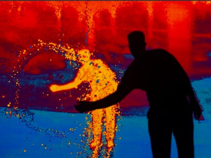 Este tipo de cámaras de infrarrojos se usan por lo general en contextos bélicos o de vigilancia carcelaria, y también para identificar posibles migrantes en zonas fronterizas. Todos ellos son usos en efecto siniestros que Lozano-Hemmer evoca y revierte al mismo tiempo. “Políticamente es una manera de subrayar y visibilizar estos sistemas de control”, explica el artista. “Ahora que está surgiendo un nuevo tipo de radicalización, los artistas tenemos el reto de pensar diferente. También en España, donde vemos surgir nuevos extremismos que yo pensaba que estaban superados, pero al parecer no. Yo mismo viví allá durante 20 años en dos épocas distintas, así que he sido migrante en España. Este tipo de cámaras generan reflexiones interesantes, porque ante ellas somos todos muy parecidos: no importa el color de piel, el género o la clase, sino cómo emanamos calor. Para ellas somos seres de 37 grados. Y hay algo en esto que invita a pensar que tenemos mucho más en común que diferencias. Hoy puedes ser un país rico y quizá mañana un país que genera emigrantes: eso le ha pasado a México, y también a España”.