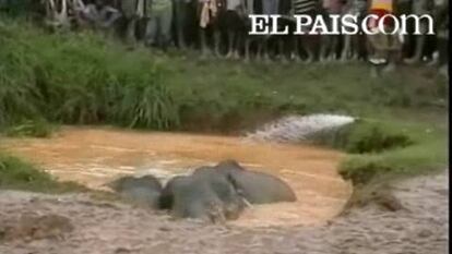 Dos elefantes consiguen escapar de un estanque en la India gracias a la ayuda de los aldeanos