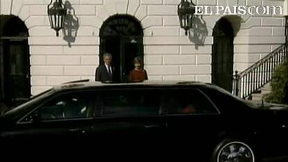 El presidente saliente y la primera dama, Laura Bush, recibieron al matrimonio Obama con sonrisas y apretones de manos cuando se bajaban de su limusina. Sus dos hijas pequeñas, Malia, de 10 años, y Sasha, de 7, se quedaron en Chicago para ir al colegio, donde las ha despedido con un beso su padre esta mañana.