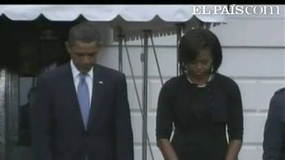 El presidente de Estados Unidos, Barack Obama, ha conmemorado este viernes el octavo aniversario de los atentados del 11-S, el primero desde que está en la Casa Blanca. Con una comparecencia en los jardines de su residencia, Obama ha afirmado que Estados Unidos continúa su compromiso en proteger a sus ciudadanos y luchar contra los responsables de los atentados: "Vamos a mantener nuestra determinación contra aquéllos que llevaron a cabo este acto deplorable".