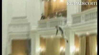 Un hombre se tira desde un balcón del Parlamento rumano en protesta por los recortes económicos durante una intervención del primer ministro