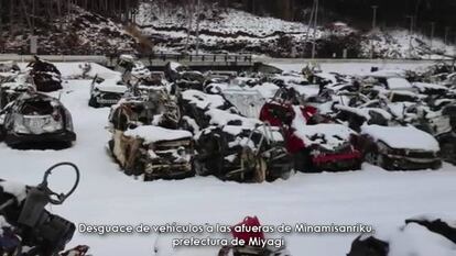 En este inmenso centro de reciclaje, resalta la presencia en grandes campas de miles de coches encogidos como garbanzos, brillantes aún en las pocas superficies que no resultaron plegadas por la fuerza del mar. Campas como una que duerme entre colinas y bosques a las afueras de Minamisanriku (prefectura de Miyagi). Son el cementerio de la modernidad de un Japón sacudido aún en lo más profundo por el peor desastre que ha vivido desde la II Guerra Mundial.