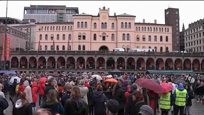 Decenas de miles de noruegos se han reunido en la plaza Youngstorget, en el centro de Oslo, en un emotivo acto en el que han cantado Barn av regnbuen (Niños del arco iris) que, según Anders Behring Breivik es un ejemplo del adoctrinamiento marxista impulsado por el partido laborista.