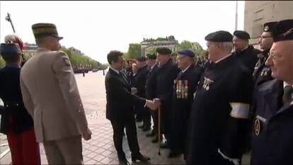 Sarkozy, que había invitado al acto a Hollande, saludó al presidente electo, que le venció el pasado domingo en las elecciones presidenciales, y ambos guardaron silencio ante la tumba del soldado desconocido.