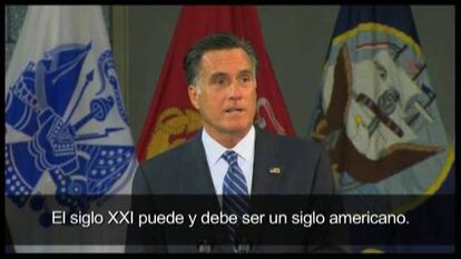 El discurso de Romney marcó un alineamiento con la ortodoxia republicana y con el ideario neoconservador. Sobre todas las ideas, destacó la de que EE UU debe dirigir con mayor fuerza los asuntos internacionales. “Mucha gente en el mundo aun contempla a América como la mejor esperanza de la humanidad”, dijo. Fue una apología del papel de EE UU como exportador de “sociedades libres y economía prósperas”. Criticó duramente la estrategia de Obama de apoyar a las naciones en su búsqueda de libertad, sin hacer el trabajo por ellas, como sucedió en el caso de Libia. “Es la responsabilidad del presidente emplear el poder de América para moldear la historia”, dijo. “No podemos dejar nuestro destino a merced de los eventos”.