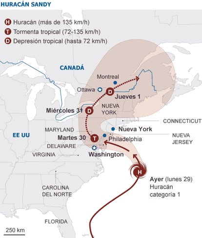 Sandy tocaba tierra en Estados Unidos alrededor de las 20.30 hora local (la una y media de la madrugada en la España peninsular) en Atlantic City (Nueva Jersey), según el Centro de Huracanes de Estados Unidos. La ciudad había declarado el lunes el toque de queda ante la previsión de inundaciones. También estaba en guardia Nueva York, donde las consecuencias han sido más devastadoras. Más de 24 horas después, el paso del huracán aún tiene en jaque a cerca de 60 millones de personas de 23 Estados del país y más de ocho millones de hogares están sin luz en las zonas más afectadas de la costa Este.