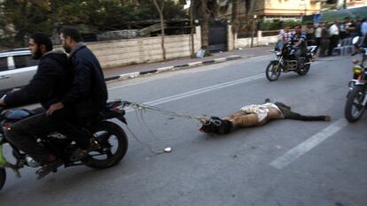 "Varios hombres armados en un minibús han abatido a los seis hombres sin salir del vehículo", describieron los testigos a AFP. Dos periodistas de France Presse aseguraron haber visto a un hombre semidesnudo atado al parachoques de un vehículo y arrastrado por las calles de un barrio del norte de Gaza (como se ve en las imágenes que acompañan a esta información).