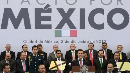México ha hecho este domingo una demostración histórica, por inédita, de consenso nacional y unidad de propósito. Las principales fuerzas políticas del país han firmado en el Castillo de Chapultepec de la capital el Pacto por México, un acuerdo nacional para el crecimiento económico, el empleo, la competitividad y la inclusión social. Esta versión mexicana de los Pactos de la Moncloa de la transición española, que marcará el sexenio que ahora empieza, incluye casi un centenar de medidas, entre las que destacan la reforma educativa, el visto bueno a la inversión privada en Pemex, la apertura a la competencia del sector de las telecomunicaciones, una ley que pone coto a la deuda de los Estados y el comienzo de la implantación de un sistema de seguridad social universal cuyo primer paso será garantizar una pensión a los mayores de 65 años.