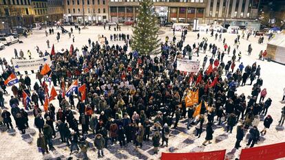 Tan solo unas horas después del acto protagonizado por Van Rompuy, Barroso y Schulz se manifestaron en el centro de Oslo medio millar de personas convocadas por 50 organizaciones para protestar contra la concesión del Nobel de la Paz 2012 a la UE. “No sentimos que se merezcan este premio unos líderes que, con sus políticas de recorte, están incendiando los países del sur”, comenta Anaa Tresse, una afiliada al partido socialista de 21 años que aguanta sin inmutarse los cinco grados bajo cero.