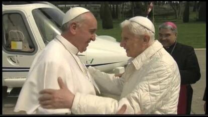 Las imágenes de dos papas rezando juntos, saludándose con afecto junto al helicóptero, hablándose —ora de tú, ora de usted— ante un cuadro de la virgen de la Humildad fueron servidas por el Vaticano, y la versión de lo que allí sucedió corresponde a su portavoz, el padre Federico Lombardi. Benedicto XVI, vestido con un hábito blanco y abrigado con un anorak del mismo color, recibió al papa Francisco en el helipuerto de Castel Gandolfo. Juntos se trasladaron a la capilla, donde Ratzinger ofreció a su sucesor el reclinatorio central, que Bergoglio rechazó diciéndole: “Somos hermanos”. Tras rezar juntos, el papa Francisco regaló a Benedicto XVI un cuadro de la Virgen. “Me permita, cuando lo he visto he pensado en ti por todos los ejemplos de humildad y ternura que nos ha dado en su pontificado”.