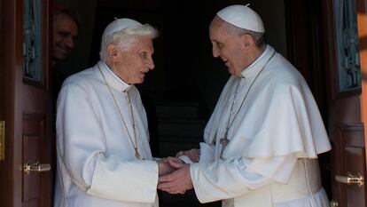 Benedicto XVI se marchó del Vaticano a su estilo, con todas las campanas de Roma diciéndole adiós y una superproducción de vídeo en directo siguiendo su helicóptero camino de Castel Gandolfo, donde tres horas después —a las ocho de la tarde del 28 de febrero— dejó por propia voluntad de ser Papa. La Iglesia, aún entonces bajo la conmoción de una renuncia marcada por los escándalos, quedaba a expensas de conocer el rostro, y sobre todo el perfil, del nuevo Pontífice. Este jueves, Joseph Ratzinger regresó al Vaticano. Lo hizo al estilo de su sucesor, sin televisión en directo ni ningún tipo de pompa. Solo fue distribuida una fotografía, en la que se ve al papa Francisco recibir a Benedicto XVI en la puerta del recién rehabilitado monasterio Mater Ecclesiae, donde el papa emérito vivirá a partir de ahora. Nunca dos papas habían convivido en el interior del Vaticano.