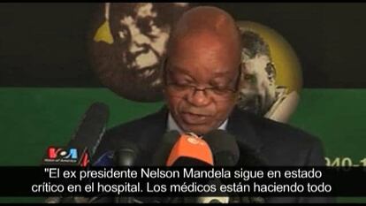 El presidente sudafricano, Jacob Zuma, ha declarado este lunes que el estado de Nelson Mandela continúa siendo “crítico” y ha confirmado que cuando anoche fue a visitarlo al hospital estaba “adormecido”. En un encuentro informal con periodistas ha insistido en los mismos términos del comunicado oficial de anoche para decir que los médicos están haciendo lo que está en su mano por Mandela pero al mismo tiempo ha destacado que hay que “aceptar que se trata de un hombre viejo”, por lo que se entiende que está preparando a la ciudadanía para lo peor. “No soy médico pero cuando una persona está crítica, está crítica. Son momentos difíciles”, ha dicho.