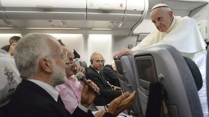 Meia hora depois de decolar do Rio de Janeiro com destino a Roma, o papa Francisco se apresentou perante os jornalistas que o acompanhavam no voo papal –75 enviados especiais de 14 países – para responder a quantas perguntas quisessem fazer. Não havia perguntas combinadas, nem censura. Durante uma hora e 20 minutos, Jorge Mario Bergoglio, de 76 anos, respondeu com amabilidade e sem rodeios sobre os assuntos mais polêmicos da vida da Igreja, enquanto o Airbus A330 da Alitalia, de código AZ4000, destinado aos voos papais, atravessava uma tempestade. De pé, Francisco falou sobre a corrupção no banco do Vaticano, sobre a detenção de Monsenhor Nunzio Scarano – “não fui à cadeia, porque ele queria fazer um papel de beata Imelda” – sobre a necessidade de uma teologia da mulher na Igreja, sobre os gays –“quem sou eu para criticá-los?”— e até sobre sua relação com Joseph Ratzinger: “a última vez em que houve dois papas, eles não se falavam, disputavam para ver quem era o autêntico. Eu quero muito bem a Bento XVI. É como ter um avô em casa”.
