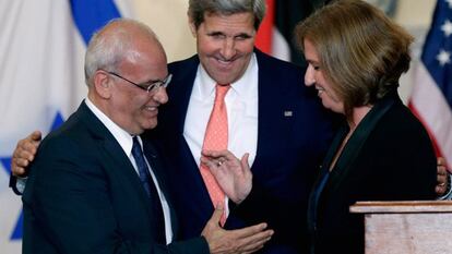 Los plazos están ya decididos y las posturas iniciales, claras. Ningún asunto quedará fuera de la mesa de negociaciones. Israelíes y palestinos volverán a reunirse en dos semanas, en Israel o Cisjordania, para proseguir unas negociaciones que tras tres años de estancamiento ha revitalizado el gran empeño de la Casa Blanca y su secretario de Estado, John Kerry. Los negociadores de ambos bandos llegaron a Washington el lunes con pocas concesiones, ninguna expectativa y poco margen de maniobra ante sus respectivos gobiernos. Emergieron este martes, en la ronda inicial de contactos, esperanzados y determinados a buscar vías para una paz que, según dijeron, pasa por la creación de un Estado palestino y el derecho a la seguridad plena de Israel.