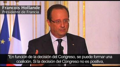 El presidente francés, François Hollande, ha reiterado el lunes que Francia no actuará sola en Siria, y ha admitido que la condición para formar una coalición internacional que castigue al régimen de Bachar El Asad por el uso de armas químicas contra su pueblo es que el Congreso de Estados Unidos dé “luz verde” a la intervención militar deseada por Barack Obama el próximo día 9. “Si la decisión no fuera positiva, entonces Francia no actuaría sola pero asumiría su responsabilidad apoyando a la oposición en Siria de forma que una respuesta sea dada”, ha afirmado Hollande, revelando así que el alcance del plan B es bastante más modesto que el de la idea original.