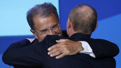 No faltó la situación de las minorías sexuales en Rusia y la preocupación que éste suscita en occidente. Putin se adelantó a los planteamientos y preguntas de sus interlocutores y tras hablar de su buena relación con el exjefe del Gobierno italiano, Silvio Berlusconi, exclamó: “Le juzgan ahora porque vive con mujeres pero si Berlusconi hubiera sido homosexual, nadie hubiera levantado un dedo contra él”. Prodi, al que Putin había incluido en la categoría de amigo suyo en igualdad de condiciones con Berlusconi, hizo un gesto de protesta, pero acabó echándose a reír. Por lo demás, la argumentación del líder ruso fue la habitual, a saber, que los problemas demográficos de Europa y de Rusia no pueden solucionarse con los matrimonios homosexuales. La ley rusa prohíbe la propaganda de la homosexualidad entre los menores, pero las minorías sexuales, dijo, no están discriminadas en Rusia y tienen acceso a cargos y a condecoraciones del Estado.