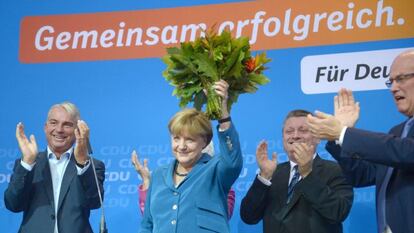 La canciller Angela Merkel obtuvo este domingo una abrumadora victoria en las generales alemanas, que la dejó a las puertas de la mayoría absoluta en el Parlamento federal (Bundestag). Según el escrutinio del 100% de los votos, su Unión Demócrata Cristiana cosechó un espectacular 41,5% de los votos junto a sus aliados bávaros de la CSU. Sumaron los democristianos la friolera de casi ocho puntos respecto a las elecciones de 2009. Es un porcentaje que no alcanzaban desde 1990, en mitad de la euforia por la unificación de las dos Alemanias. Merkel prometió que llevarán el amplio triunfo “con prudencia y responsabilidad”. Sin embargo, la canciller se quedó a cinco escaños de la mayoría absoluta con 311 de los 630 escaños que tendrá el Parlamento.