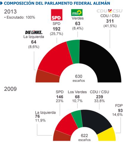 La canciller Angela Merkel ha comenzado este lunes sus contactos con los socialdemócratas del SPD para negociar la coalición que gobernará Alemania durante los próximos cuatro años. Su Unión Demócrata Cristiana obtuvo en las generales del domingo 311 de los 630 diputados para el Bundestag de esta legislatura, así que partirá de una posición de abrumadora ventaja en la mesa de diálogo. La jefa democristiana ha rechazado la posibilidad de gobernar en minoría y ha insistido en la necesitad de “un gobierno estable” en Alemania. Además de al SPD, Merkel quiere sondear a Los Verdes para estudiar nuevas posibilidades de Alianza. La canciller descarta pactar con el partido La Izquierda (Die Linke), que desde el domingo es la tercera fuerza política del país. El hundimiento de sus socios liberales en el actual Gobierno, que se han quedado fuera del Bundestag, dejan a Merkel ante el dilema de con quién gobernar.