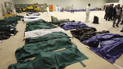 La respuesta no oficial le ha llegado. En el cementerio ya no hay más tierra para tumbas sin nombre. Y tampoco en la morgue ni en el pequeño puerto hay espacio para tantos cadáveres de hombres, niños y mujeres embarazadas. Los cuerpos recuperados de las aguas y los localizados, a última hora de la tarde, en el interior del pecio hundido se están trasladando a un hangar del aeropuerto, adonde también llegó a media tarde el vicepresidente del Gobierno y ministro del Interior, Angelino Alfano, quien confirmó los detalles del naufragio —los teléfonos que no funcionaban, los trapos que se prendieron, las cifras cada vez más insoportables de ahogados—, pero no quiso entrar en la cuestión que ensombrecía aún más la jornada. ¿Es verdad que tres barcos pesqueros habían visto la angustia de los inmigrantes y no les habían ayudado? “No los han visto”, respondió el ministro, “si no, habrían intervenido. Los italianos tienen un gran corazón. Hemos salvado la vida a 16.000 náufragos”.