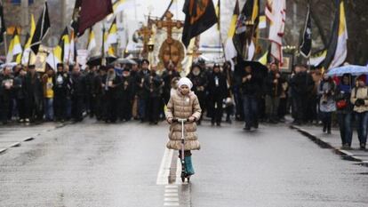 Enmascarados y jóvenes haciendo el saludo nazi y carteles con lemas del tipo Rusia para los rusos abundaron en la manifestación, en la que participaron, según las diferentes fuentes, entre 8.000 (estimación de la policía) y 20.000 personas (cálculo de los organizadores). Aunque en general la marcha se desarrolló sin excesos, la policía detuvo a una treintena de jóvenes por "llevar máscaras, gritar consignas nazis y utilizar símbolos prohibidos".