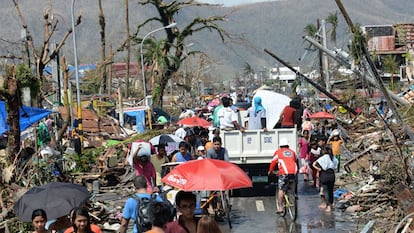 Al menos 10.000 personas se cree que han muerto solo en una de las provincias que resultaron devastadas por el supertifón que azotó Filipinas el viernes pasado, según el último balance de la policía del país asiático. Este domingo, dos días después, comienza a percibirse el gran alcance de la tragedia. Pueblos arrasados por olas de cinco y seis metros provocadas por el huracán, barrios enteros destruidos, cadáveres colgando de los árboles, viviendas arrancadas de cuajo, amasijos de escombros. Son las imágenes que llegan del que se perfila como el peor desastre natural jamás registrado en Filipinas. Poco después de alcanzar la costa, Haiyan sopló con vientos de 314 kilómetros por hora y rachas de 378, que arrasaron todo a su paso. En la madrugada de este lunes tocó tierra en Vietnam, según informó el Centro de Alerta de Tifones de EE UU.