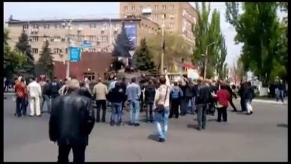 Según la versión de Kiev, el asalto se desencadenó cuando medio centenar de “terroristas” —la denominación del Gobierno para los milicianos prorrusos— intentó atacar el edificio para proteger a un grupo de agentes insurrectos acantonados. Fuentes prorrusas locales acusaron al Ejército y la Guardia Nacional de abrir fuego contra un millar de manifestantes que intentaban impedir la detención de presuntos agentes rebeldes. Varios ciudadanos intentaron parar uno de los blindados rodeándolo a pecho descubierto.