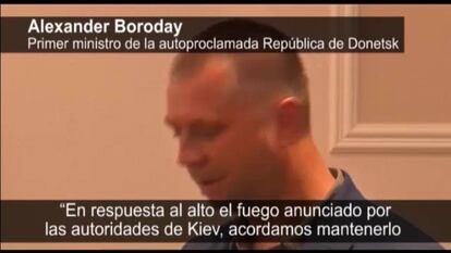 “Nos comprometemos a interrumpir el fuego hasta el 27 de junio en respuesta al alto el fuego por parte de Kiev”, dijo Borodái, según la agencia rusa Ria Nóvosti. Si hay un alto el fuego, “podemos ponernos de acuerdo y, por lo menos, comenzar consultas sobre el mantenimiento de conversaciones para una regulación pacífica del conflicto”, señaló el líder separatista, un experiodista que asesoró a los separatistas de Crimea. “Se interrumpe el desplazamiento de tropas por el territorio de la república y el uso de las armas”, agregó Borodái, quien expresó además su esperanza de que la Federación Rusa vigilará el cumplimiento del alto el fuego.
