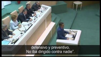 Desde Austria, Putin advirtió que Rusia siempre defenderá a “los rusos étnicos en Ucrania y a aquella parte de la población y pueblo de Ucrania que tienen indestructibles vínculos” étnicos, culturales y lingüísticos con Rusia y que se “sienten parte del amplio mundo ruso”. Rusia no solo está dispuesta a “vigilar”, sino también a “reaccionar”, dijo y advirtió: “Espero que no se necesiten fuerzas armadas para ello”. La disposición para utilizar el Ejército ruso en Ucrania fue aprobada, a requerimiento de Putin, por el Consejo de la Federación el 1 de marzo pasado y sirvió para legitimar el envío de contingentes armados a Crimea.