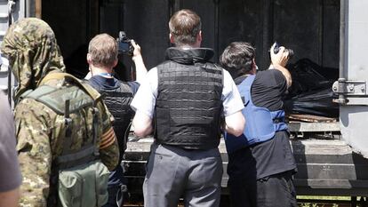 La demora en el traslado de los cuerpos a un lugar seguro —los combates continuaron este domingo en la provincia de Lugansk e incluso en los alrededores de Donetsk— provocó el enésimo cruce de acusaciones entre las autoridades de Kiev y los rebeldes. “Se quedarán aquí [en la estación de Torez] por el momento, hasta que la cuestión [de qué hacer con ellos] se resuelva. Seguimos esperando a los expertos”, dijo Serguéi Kavtaradze, funcionario de la RPD. Con sarcasmo, otro líder rebelde, Andréi Purguin, presidente del Parlamento de la RPD, apuntó que los investigadores internacionales “deben de estar viniendo a pie desde Kiev”, por el tiempo que tardan en llegar. “Ha sido muy difícil lograr un acuerdo escrito para trasladar los cadáveres (...) y asegurarnos de que no van a decir que somos unos salvajes que hemos dejado a los muertos al sol”, añadió Purguin.
