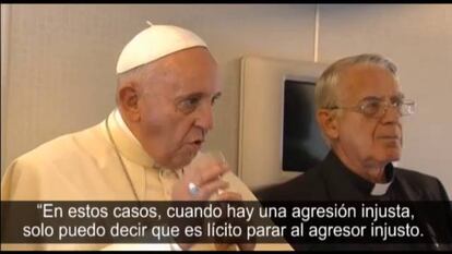 “En los casos en los que hay una agresión injusta, sólo puedo decir que es legítimo parar al agresor injusto”, respondió Francisco a una pregunta sobre los bombardeos de EE UU a los milicianos del EI, según la transcripción de Reuters.