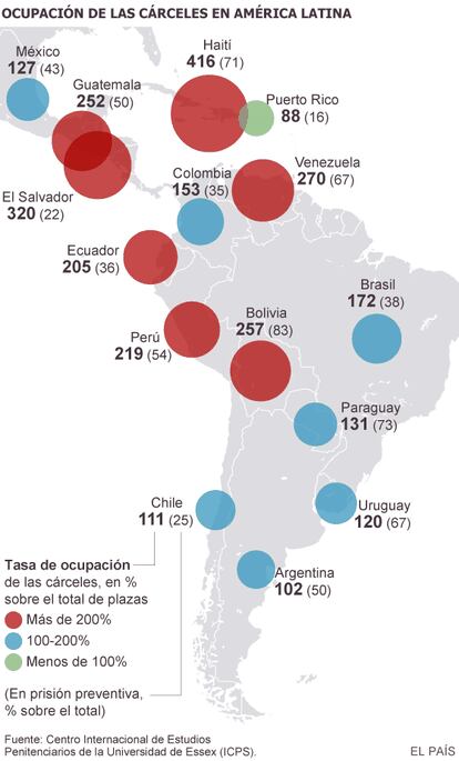 Además, entre los diez países cuyas cárceles son las más pobladas del mundo, hay cuatro latinoamericanos. Haití encabeza la lista, con una tasa de ocupación carcelaria del 416%. Le siguen El Salvador, en cuarto lugar, con un 320% de sobrepoblación; Venezuela (270%) en séptimo; y Bolivia (256%) en octavo, según datos del Centro Internacional de Estudios Penitenciarios de la Universidad de Essex (ICPS). La superpoblación en Paraguay alcanza un 131%, pero en su principal centro, la Penitenciaria Nacional de Tacumbú, esa cifra salta al 333%, según reportes de la Defensoría del Pueblo de ese país.