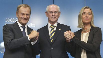 La política económica de la Unión se ha tensado demasiado —en relación con otras áreas del mundo— y llega la hora de dar un viraje al que Alemania se resiste: apenas concede giros retóricos pese a las reclamaciones de François Hollande, de Matteo Renzi y de todos los líderes que han buscado algo distinto. La nueva cúpula de la UE debe conseguir lo que no logró la anterior: que Merkel abrace ese viraje con algo más que palabras. Pero la Unión habla más alemán que nunca, y es tan moderadamente conservadora como siempre: la nueva UE sigue presidida por dirigentes populares (en el Consejo y en la Comisión) y ahora también germanófonos; Juncker y Tusk lo son, y este último hasta tuvo que disculparse este sábado por no poder expresarse en inglés. “Es difícil mantener el equilibrio entre disciplina presupuestaria y crecimiento, pero se puede hacer”, dijo en un polaco con un acento político moderadamente alemán. En su presentación en Bruselas, Mogherini se defendió de quienes le achacan inexperiencia y, respecto a Rusia, dejó claro que seguirá negociando: “No habrá solución militar. Se trata de lograr un equilibrio entre aplicar sanciones y mantener abierto el canal diplomático”. Los nombres ya han cambiado; la música, de momento, suena igual.