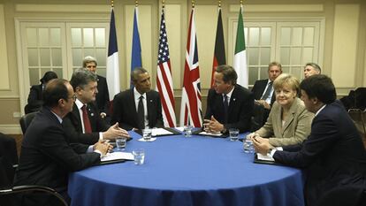 Esa incredulidad se reflejó también en la reacción de la Casa Blanca. Tras una reunión de los dirigentes de EE UU, Reino Unido, Alemania, Francia e Italia con el presidente ucranio, Petró Poroshenko, “los líderes reiteraron su condena hacia la flagrante y continua violación que hace Rusia de la soberanía e integridad territorial ucrania y acordaron la necesidad de que Rusia afronte mayores costes por su actuación”, según la Casa Blanca.