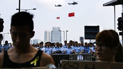 Entre los miles de muchachos muy jóvenes ataviados con camisetas negras, el uniforme de la campaña de desobediencia civil, resalta la figura del señor Chow, de 75 años. Lleva viniendo desde que los estudiantes comenzaron las primeras concentraciones frente a la sede del gobierno, hace una semana. “El pueblo está airado porque el sistema político está estrictamente controlado por Pekín. Muchos legisladores son cercanos al Gobierno central, es un sistema distorsionado. Muchas cosas que podrían beneficiar a Hong Kong no tienen posibilidad de aprobarse en el parlamento local”, denuncia. Según él, las cargas policiales del domingo han “persuadido a los ciudadanos a luchar por sus derechos”. Él mismo está dispuesto a plantar batalla. “Aunque sea viejo y esté enfermo”, asegura, mientras muestra sus respiradores para el asma, “estoy dispuesto a que me detengan e ir a la cárcel”.