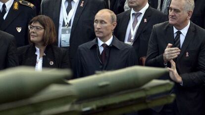 Con toda la fanfarria de un invitado de honor. Así ha recibido este jueves el Gobierno serbio al presidente ruso, Vladímir Putin, en la conmemoración de la liberación de Belgrado de la ocupación nazi, en la que colaboró el ejército soviético hace 70 años. Serbia, que ha mantenido históricamente un fuerte vínculo con Rusia, ha agasajado a Putin con su máxima condecoración —la Orden de la República Serbia de la Gran Cadena— y le ha reservado un lugar de honor en el desfile militar —el primero en caasi 30 años en el país—, que el Gobierno serbio ha adelantado cuatro días para que pudiera coincidir con la escala del ruso hacia la cumbre Euroasiática, que se inicia en Milán. Pero la visita de Putin llega en un momento clave para Serbia, y no precisamente por la conmemoración histórica. El país balcánico, candidato a la UE, trata de cuidar su cercanía con Rusia, pese a las más que congeladas relaciones que mantiene Bruselas con Moscú por el conflicto en Ucrania.