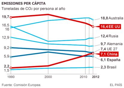 El pacto prevé que para 2025 EE UU recorte sus emisiones de gases de efecto invernadero (dióxido de carbono) entre un 26% y un 28°% con respecto a los niveles de 2005. China —el mayor emisor— seguirá aumentando sus emisiones hasta alcanzar su nivel máximo en torno a 2030 —o antes si fuera posible—, fecha en la que iniciará la reducción. Es la primera vez que Pekín se fija un plazo para iniciar la rebaja de sus emisiones.