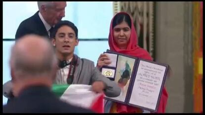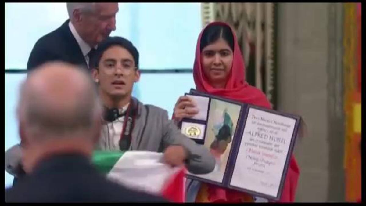La bandera que portaba el joven tenía una mancha roja en el centro, y según varios canales de televisión noruegos, antes de ser desalojado pidió a Malala: "Por favor, Malala, México".