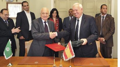 El ministro español de Asuntos Exteriores, José Manuel García-Margallo, ha firmado este domingo un memorando de entendimiento con el secretario general de la Liga Árabe, Nabil al Arabi. El acuerdo, que el jefe de la diplomacia española calificó de “ambicioso”, permitirá una mayor colaboración en asuntos políticos, económicos, científicos y culturales con la organización panárabe, formada por 22 miembros, incluida la Autoridad Nacional Palestina.