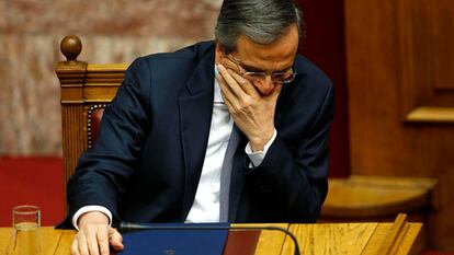 El órdago a la grande del primer ministro conservador, Andonis Samarás, al precipitar dos meses la votación parlamentaria para elegir presidente, le ha dejado sin cartas, e incluso sin Gobierno. Los griegos acudirán a las urnas el 25 de enero en unas elecciones legislativas adelantadas tras fracasar este lunes en el Parlamento, en tercera ronda, la designación del conservador Stavros Dimas como jefe del Estado. Pese al rechazo del 58,2% de los ciudadanos, que preferirían haberlos evitado, los comicios de dentro de un mes son un espejo en el que se miran griegos y extraños, ya que de ellas puede salir un Gobierno presidido por la izquierdista Syriza, en cabeza de los sondeos con el 28% de apoyos. Las elecciones generales deberían haberse celebrado en junio de 2016.