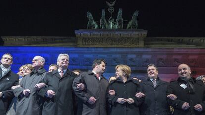 Tres versos del Corán resonaron a las seis de la tarde de este martes frente a la Puerta de Brandeburgo, en el corazón de Berlín. Atentos escuchaban las máximas autoridades del país y los representantes de las tres religiones monoteístas mayoritarias. “Los terroristas han querido separarnos, pero han logrado lo contrario”, dijo el presidente federal, el antiguo pastor protestante y luchador por la democracia en la RDA Joachim Gauck. A pocos metros estaba la canciller Angela Merkel. Después de que en las últimas semanas los islamófobos de Dresde hayan acaparado la atención internacional, Alemania ha querido mostrar su condena de los brutales atentados de París y, al mismo tiempo, recordar la importancia de la convivencia pacífica entre religiones.
